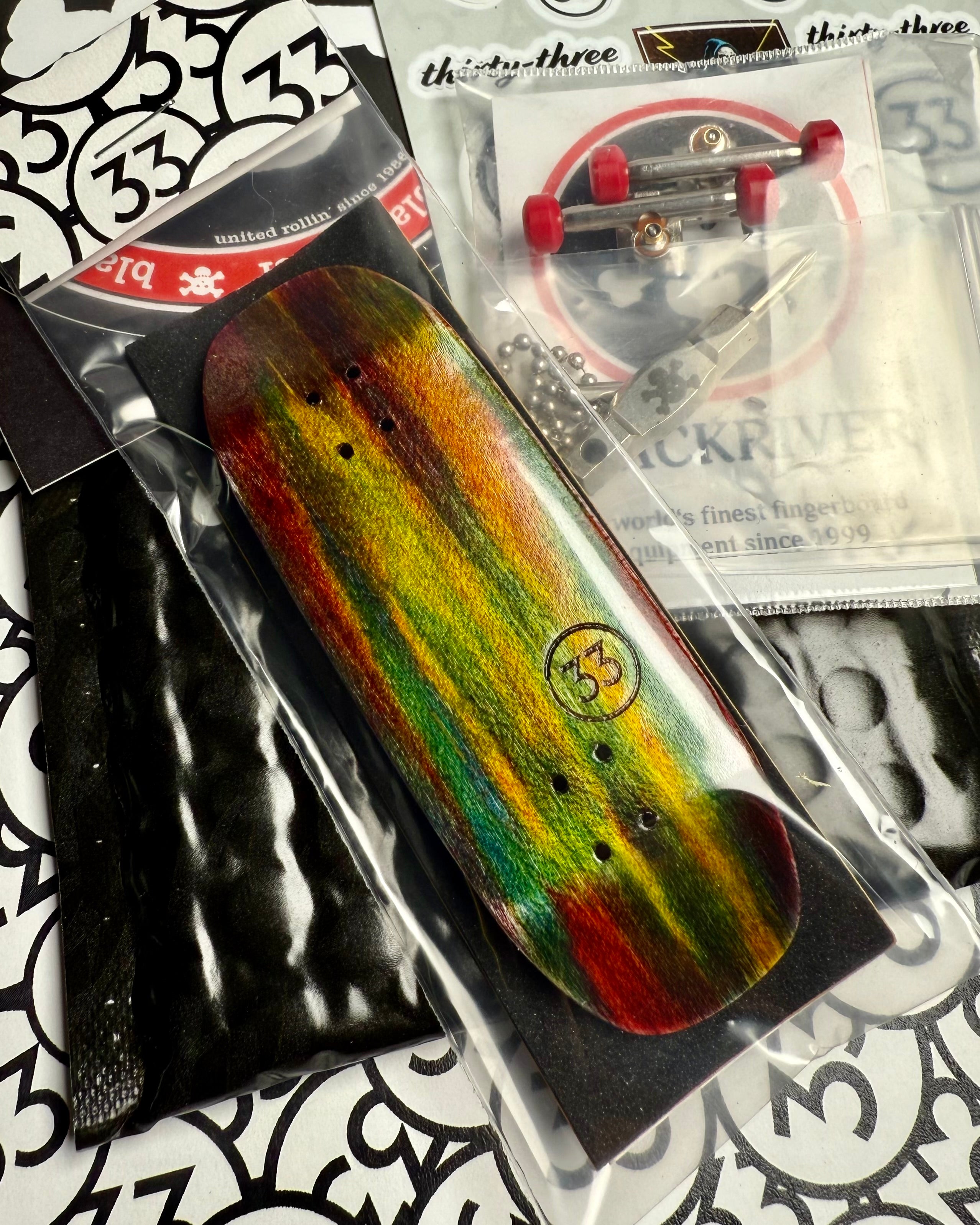 The Tie-Dye Deck brings a bold stained colorway to the lineup, blending vibrant hues with a clean 33 stamp. Built on our Scoops shape, this 95mm x 32mm deck is balanced, versatile, and ready to ride.